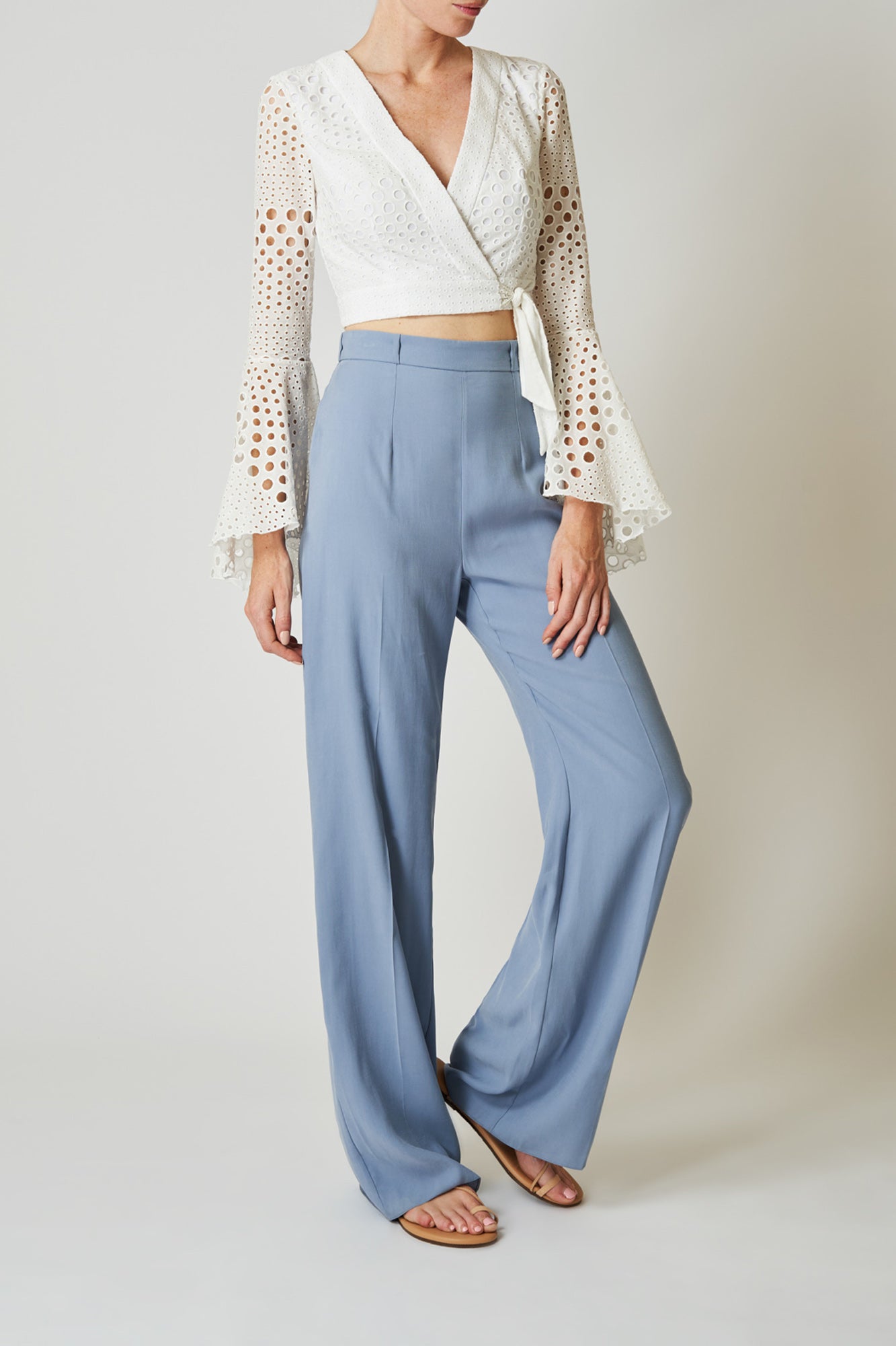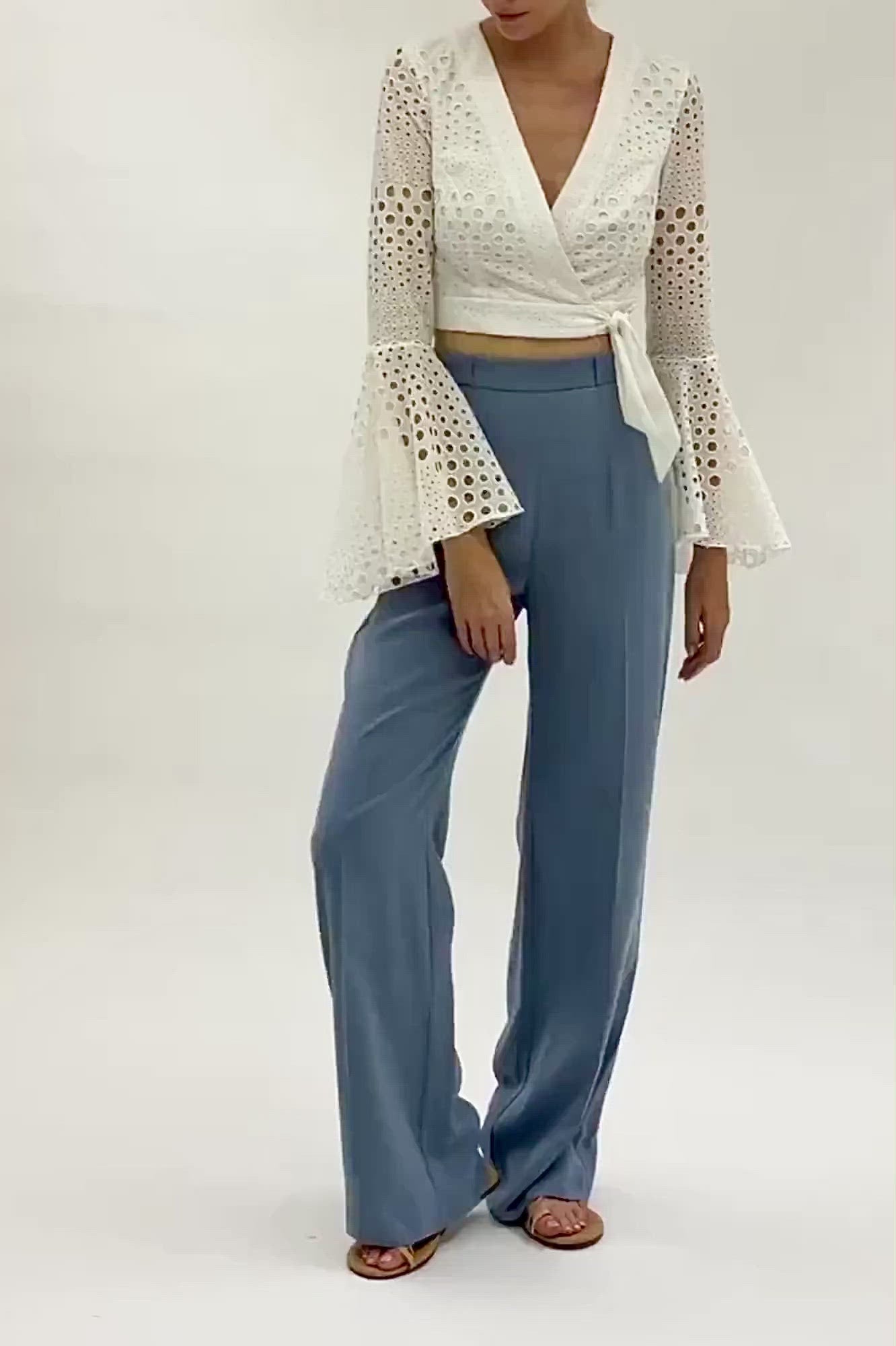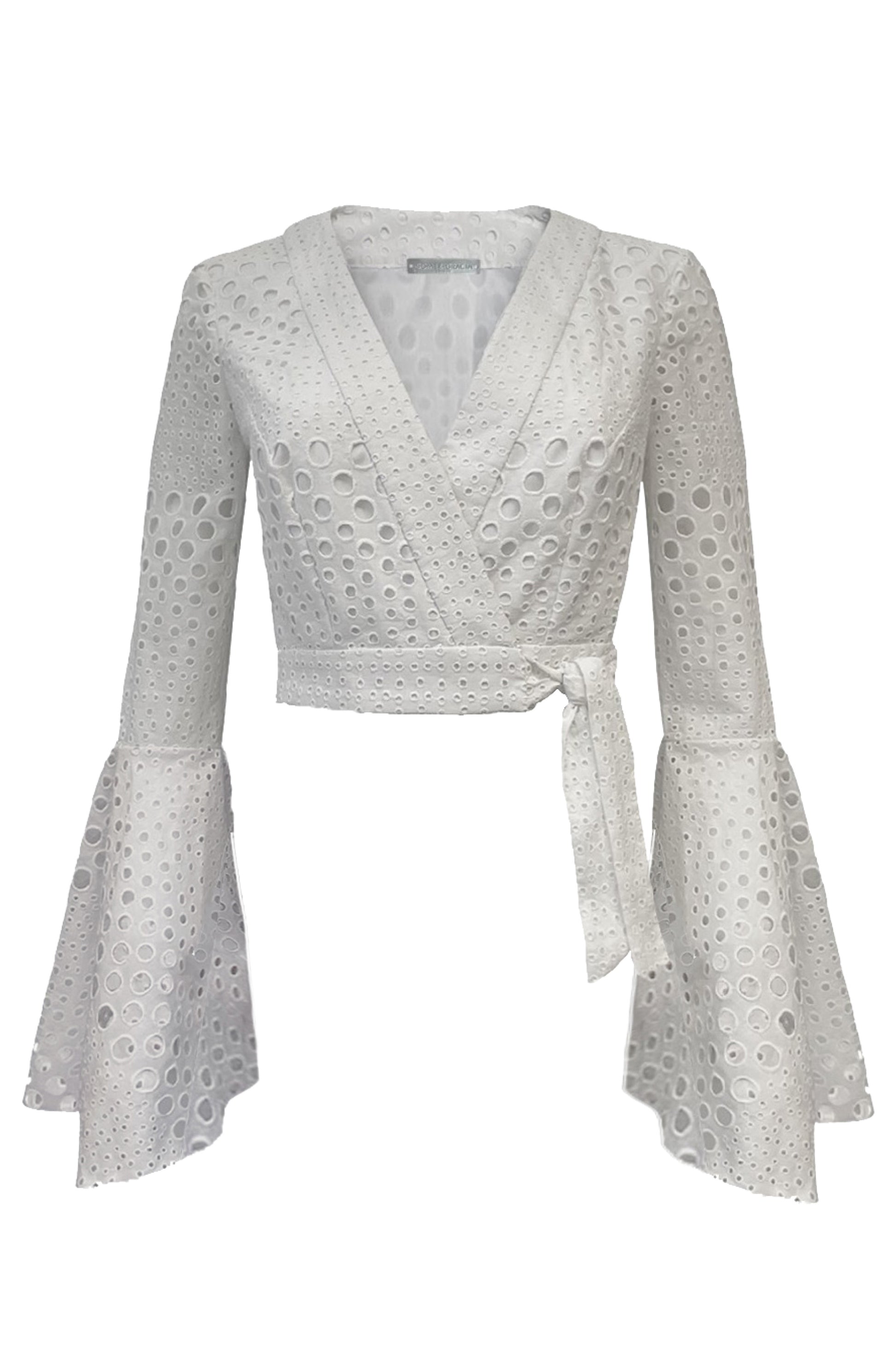 Style up your outfit with our broderie anglaise wrap front crop top. With elegant flared sleeves and fitted waist, this top will have you feeling amazing wherever you go! If you love this style but looking for some midriff coverage, check out our Tabitha top.