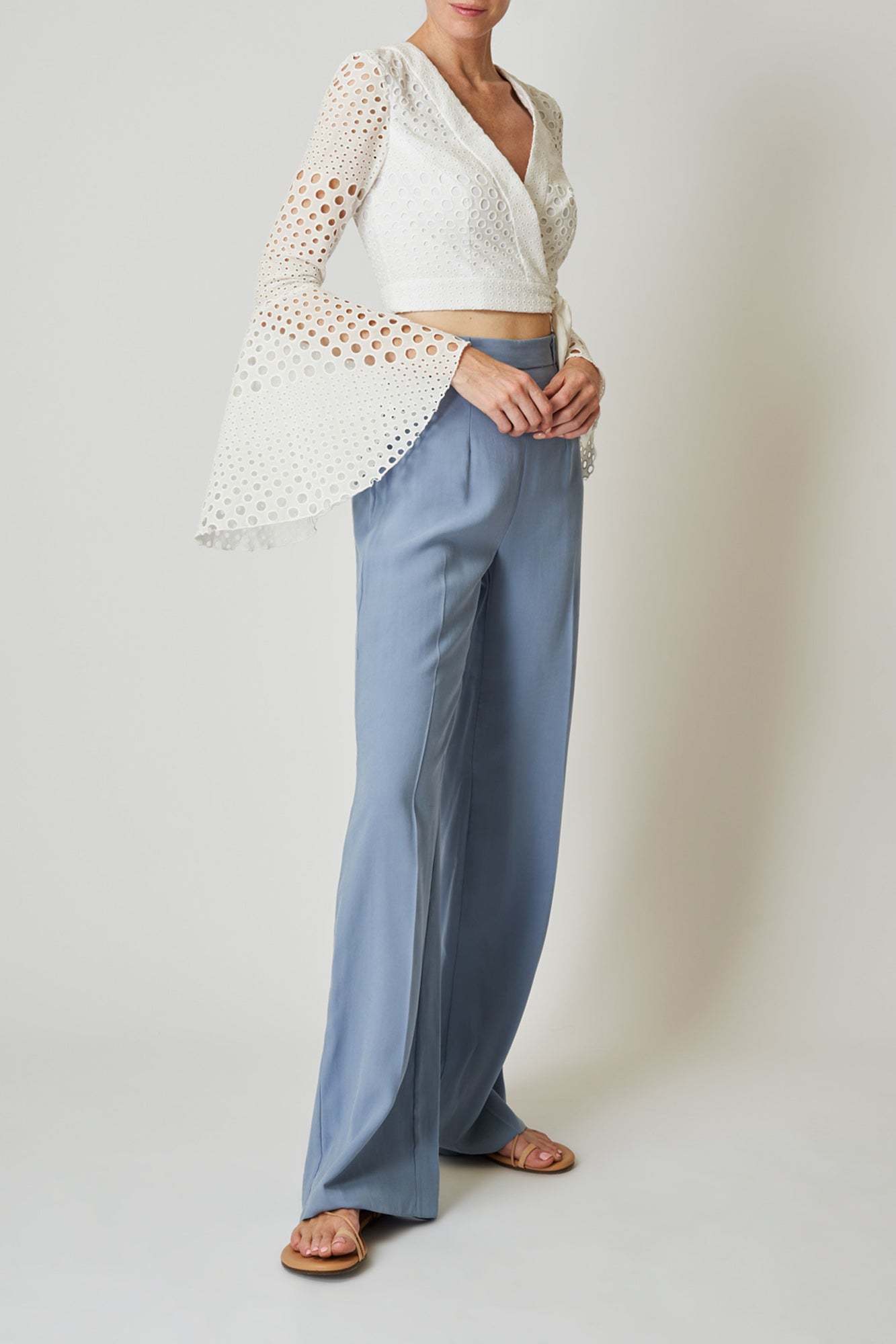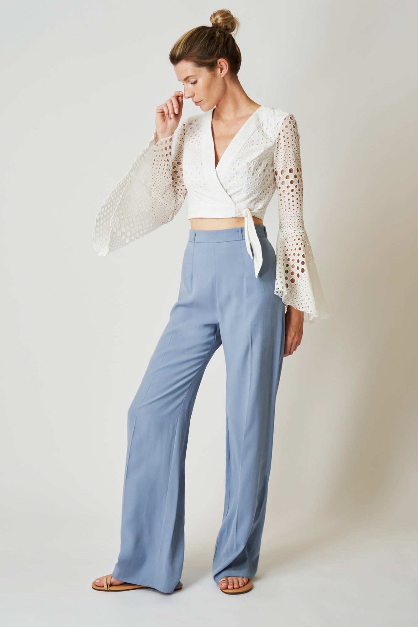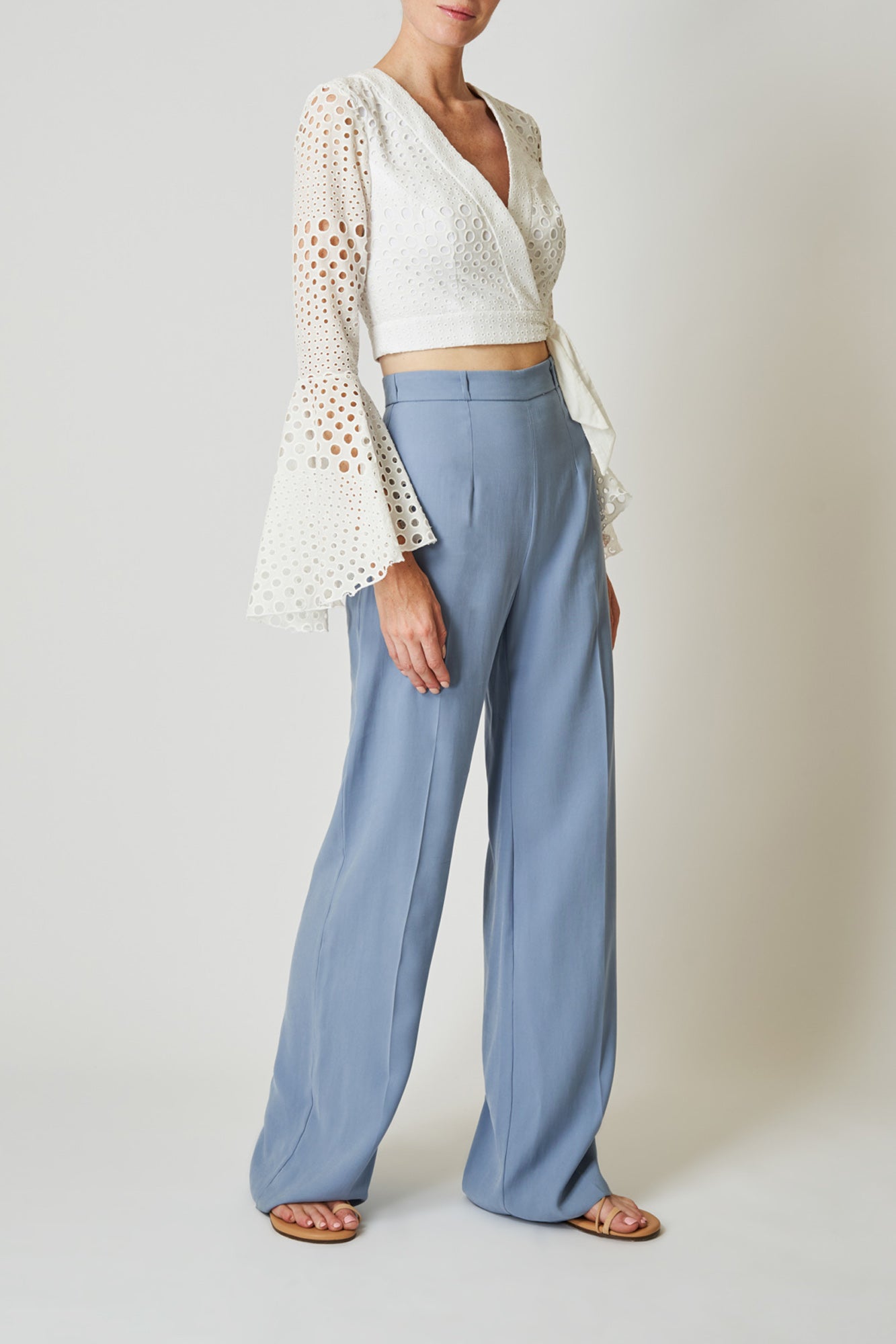 Style up your outfit with our broderie anglaise wrap front crop top. With elegant flared sleeves and fitted waist, this top will have you feeling amazing wherever you go! If you love this style but looking for some midriff coverage, check out our Tabitha top.