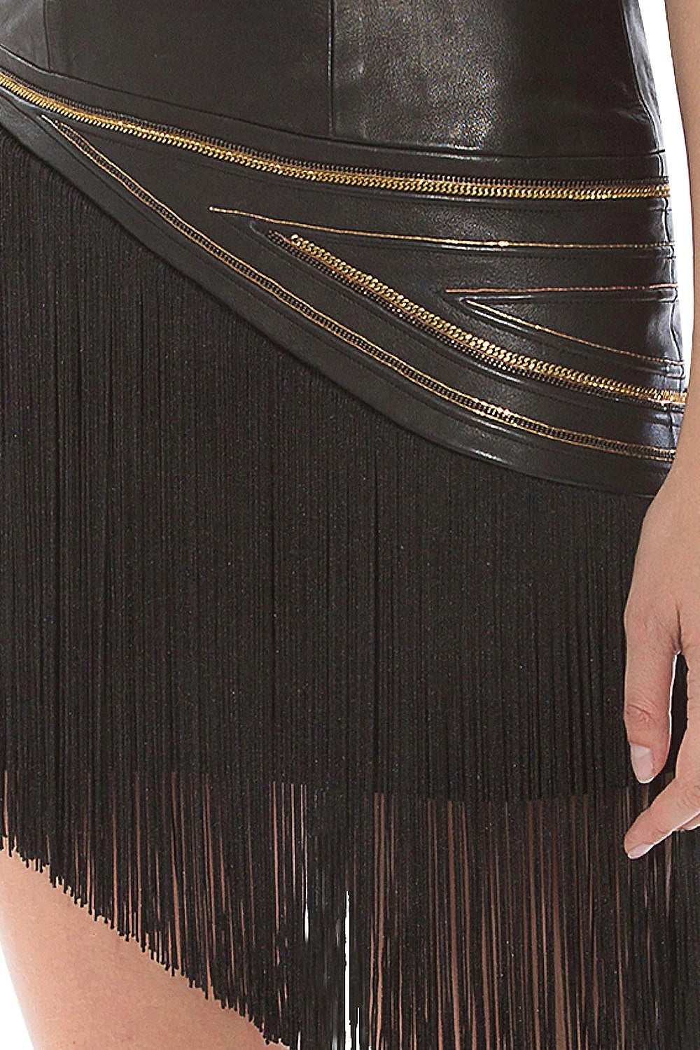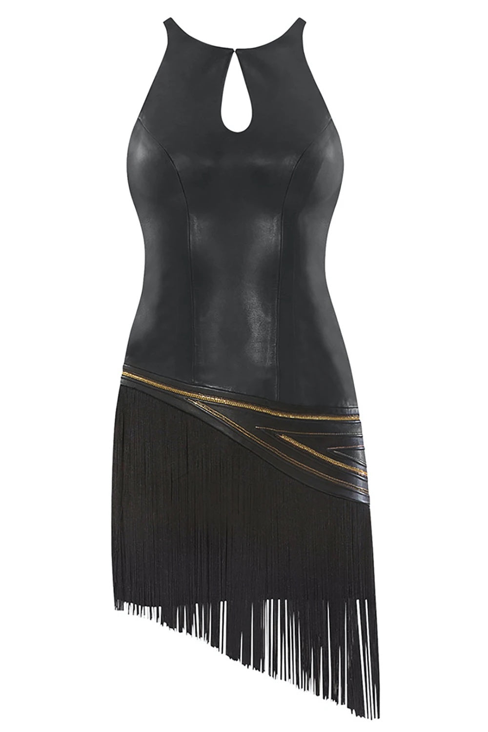 Made from luxuriously smooth lambskin leather with a silk satin lining, our dress will feel like a second skin. The movement of the fringes allows you to sashay the night away, revealing a hint of the leg with each step.