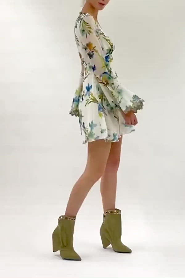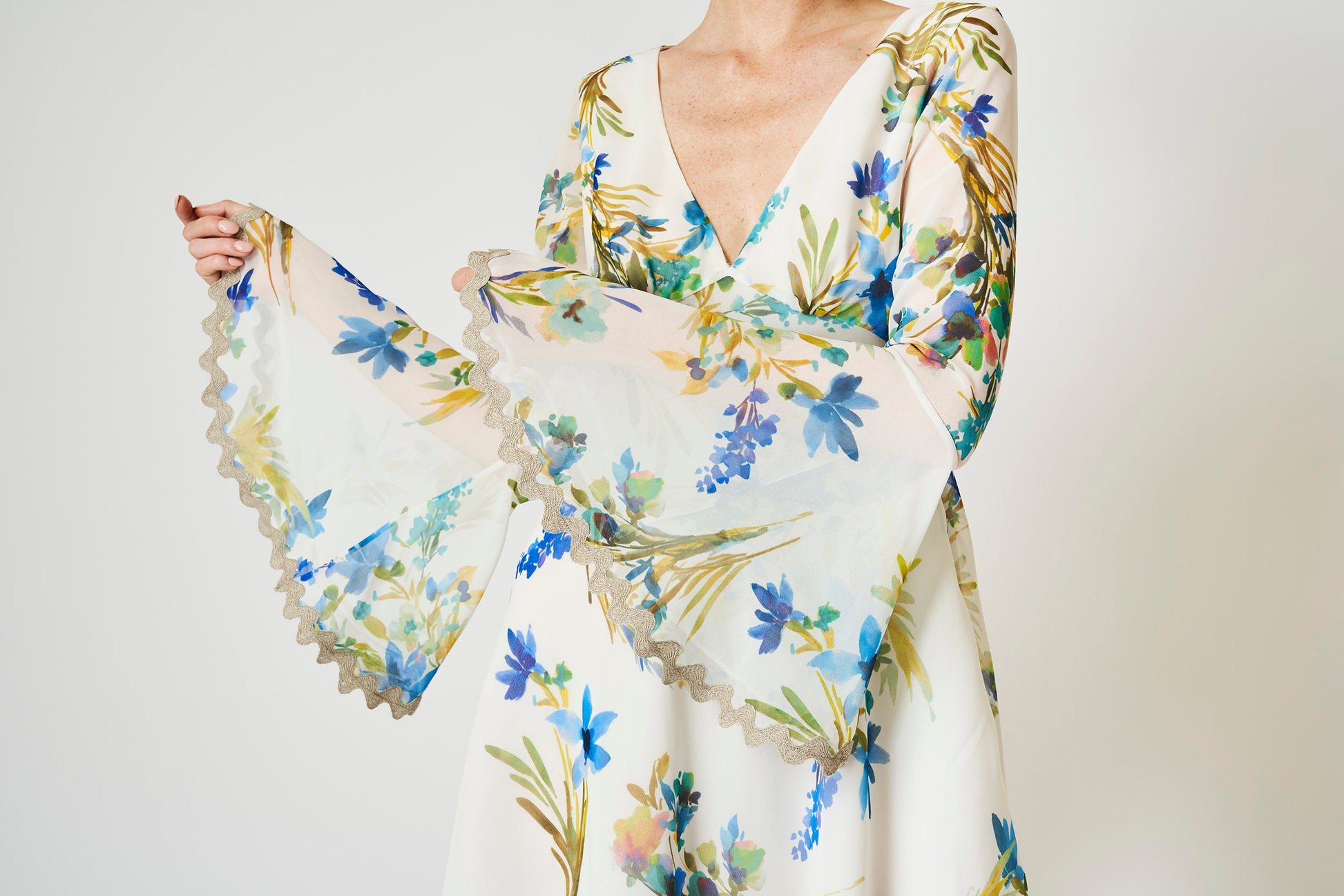 Feel phenomenal in this boho sexy and sweet bell-sleeve dress. Made from lightweight chiffon with gorgeous print and beautiful linen rik rak detailing. It hangs beautifully and in the right light, shows a hint of your figure. This will be your go-to dress for any upcoming events!