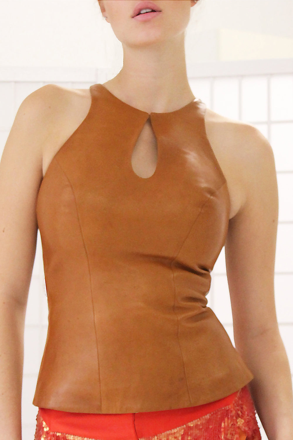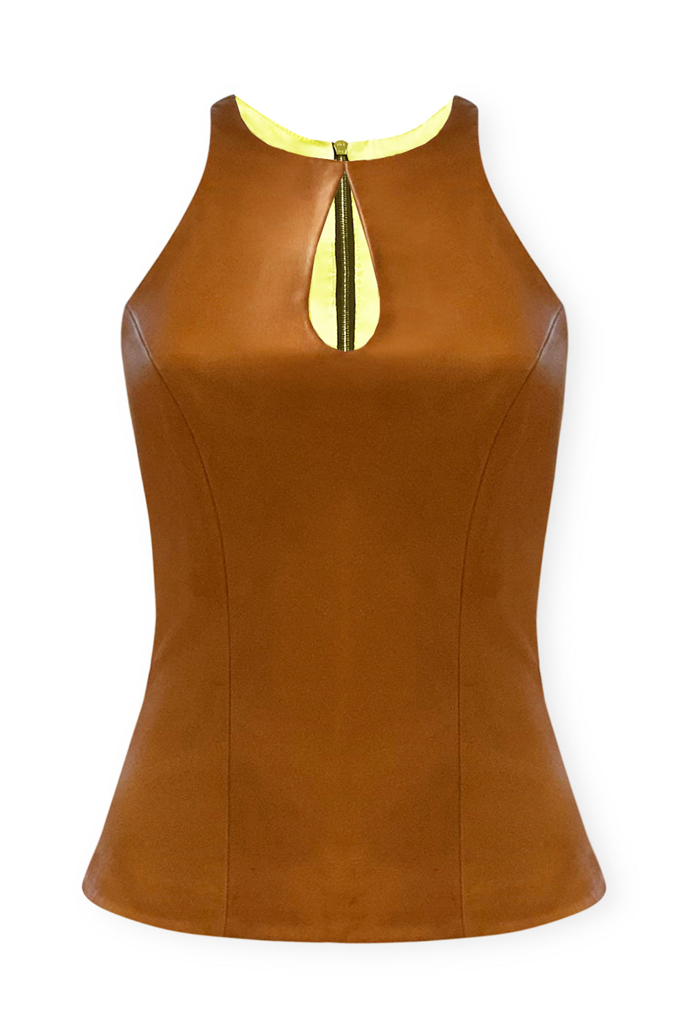 Made from a luxuriously smooth lambskin leather with a bright contrast silk satin lining, our keyhole top will feel like a second skin. Exposed zip detail on the back for ease in putting on.